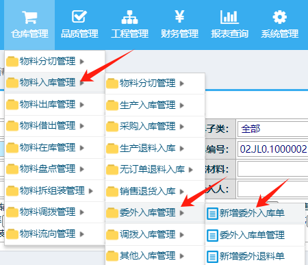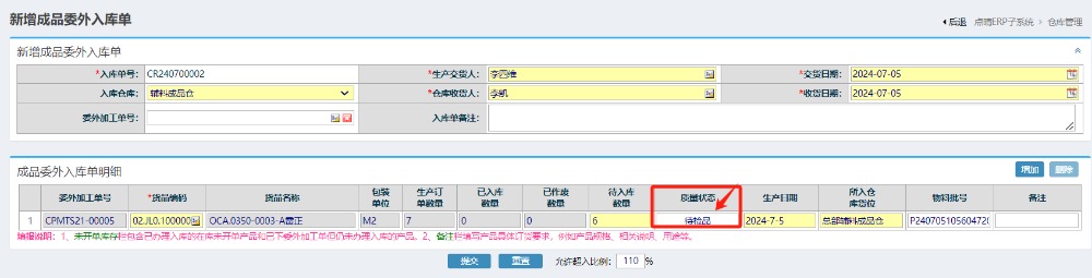 操作步骤:仓库管理-物料入库管理-委外入库管理-新增委外入库单,如下图所示: 入库时,注意质量状态默认为待检品,若质量状态不为待检品,则需要通过工程去按第