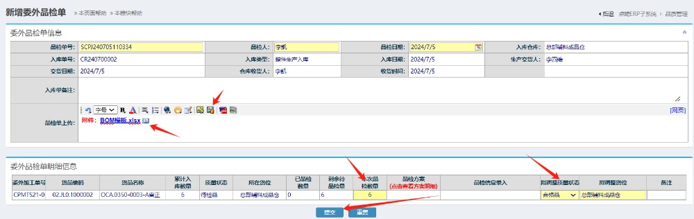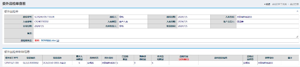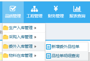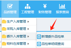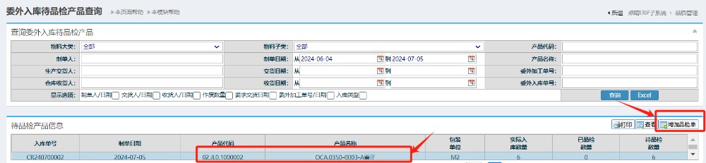 操作步骤:品质管理-委外入库管理-新增委外品检单,如下图所示: 若在此界面查不到单据,则需要通知仓库进行第 如下图:选择对应的单据,点击”增加品检单“按钮;