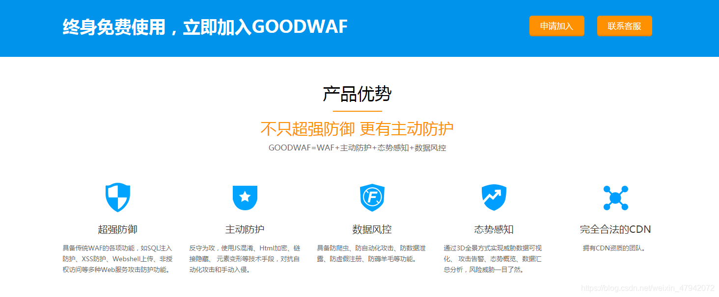 WAF想必大家都不陌生,就是WEB网站的防火墙,用来保护网站安全免受外界攻击,一般waf有三种形态,软件waf、硬件waf、云waf。 今天测试的两款waf一款是云waf名叫GOODWAF,一款是软件waf名叫ModSecurity,之所以选择这两款waf,是因为他们有一个共同点,都是开源的,也就是都是免费的。 我们先看第一款,GOODWAF。