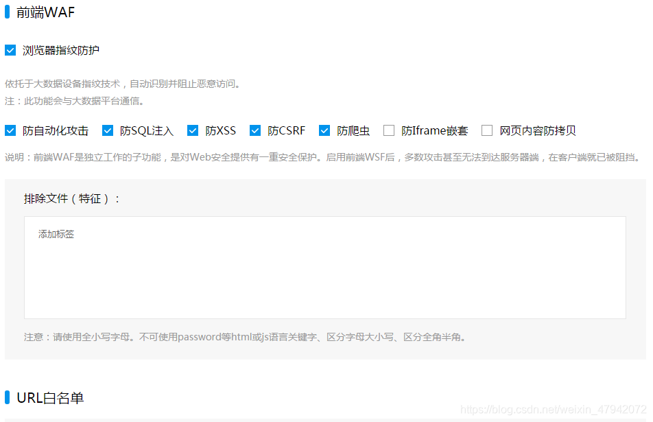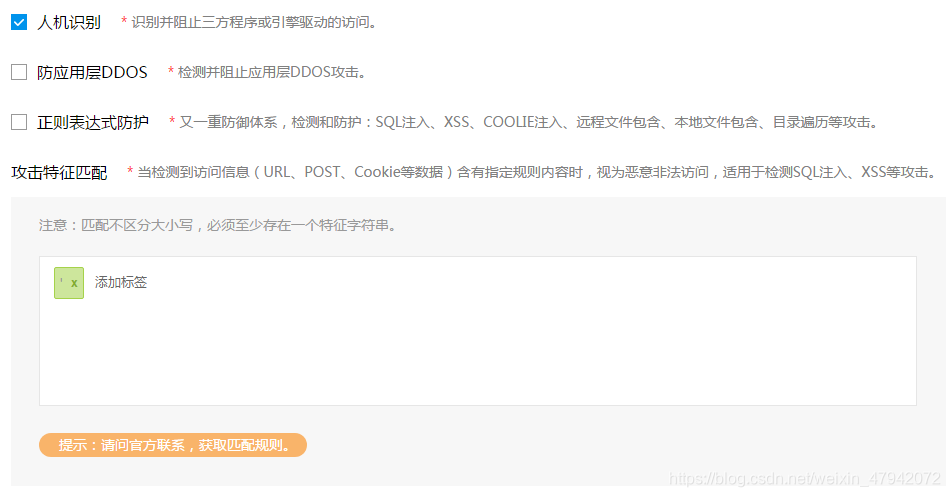 可见的功能主要是有: 传统WAF功能:防御SQL注入、防XSS跨站攻击、防web木马、防webshell上传、防盗链、关键字过滤等功能。 主动防御功能:如oday漏洞防护、扫描防护、溢出防护、网页源码加密、js保护等。 人机识别功能:如脚本攻击识别、机器人识别、防自动化攻击、防爬虫、防撞库、防暴力破解等。 数据风控功能:注册防控、消息防控、登录防控等功能。 态势感知功能:攻击溯源、数据显示、LED大屏显示、3D动态效果等功能。