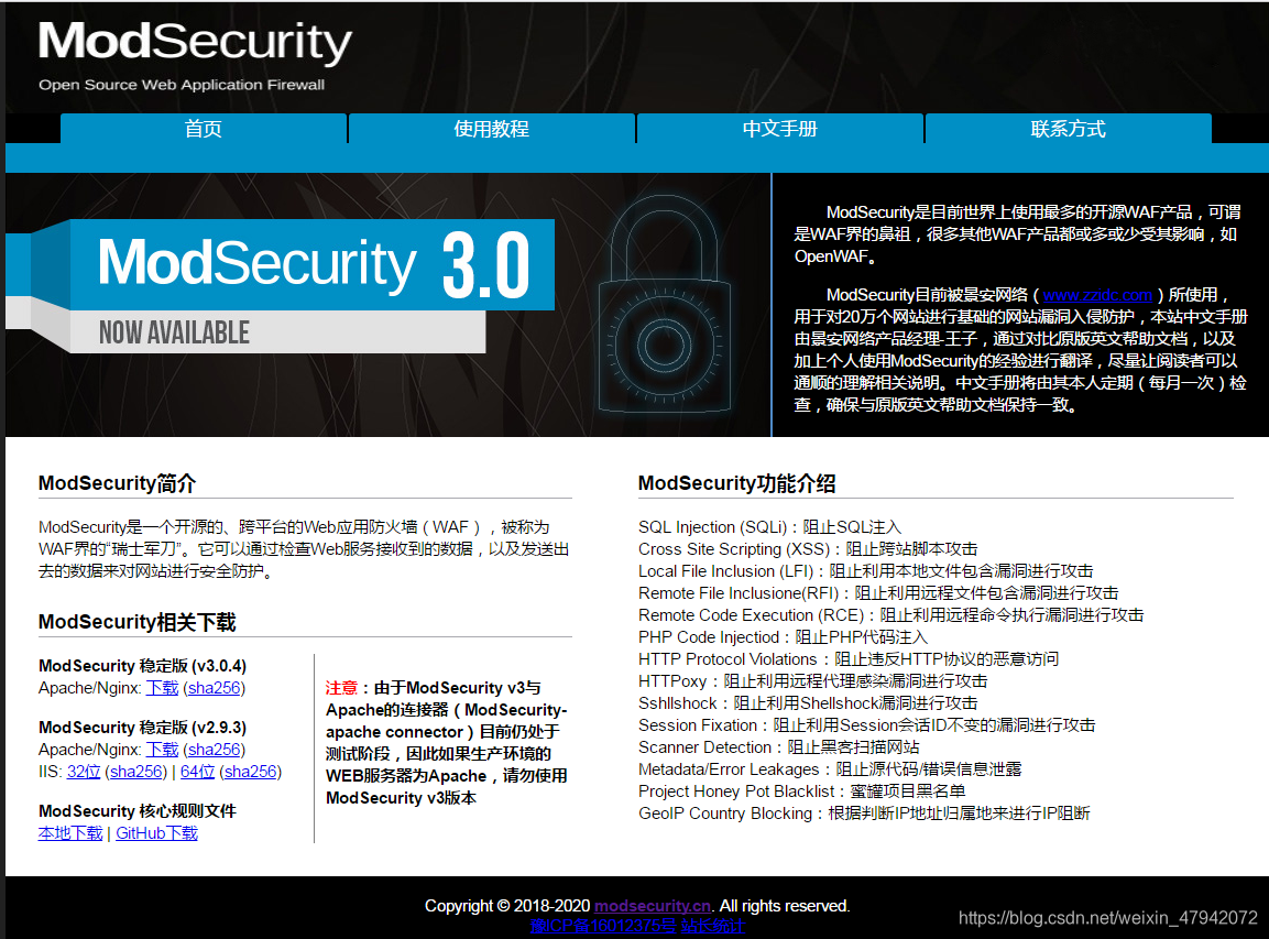 第二个测试的是modsecurity,这一款软件waf,ModSecurity最开始是一个Apache的安全模块,后来发展成为开源的、跨平台的WEB应用防火墙。它可以通过检查WEB服务接收到的数据,以及发送出去的数据来对网站进行安全防护。