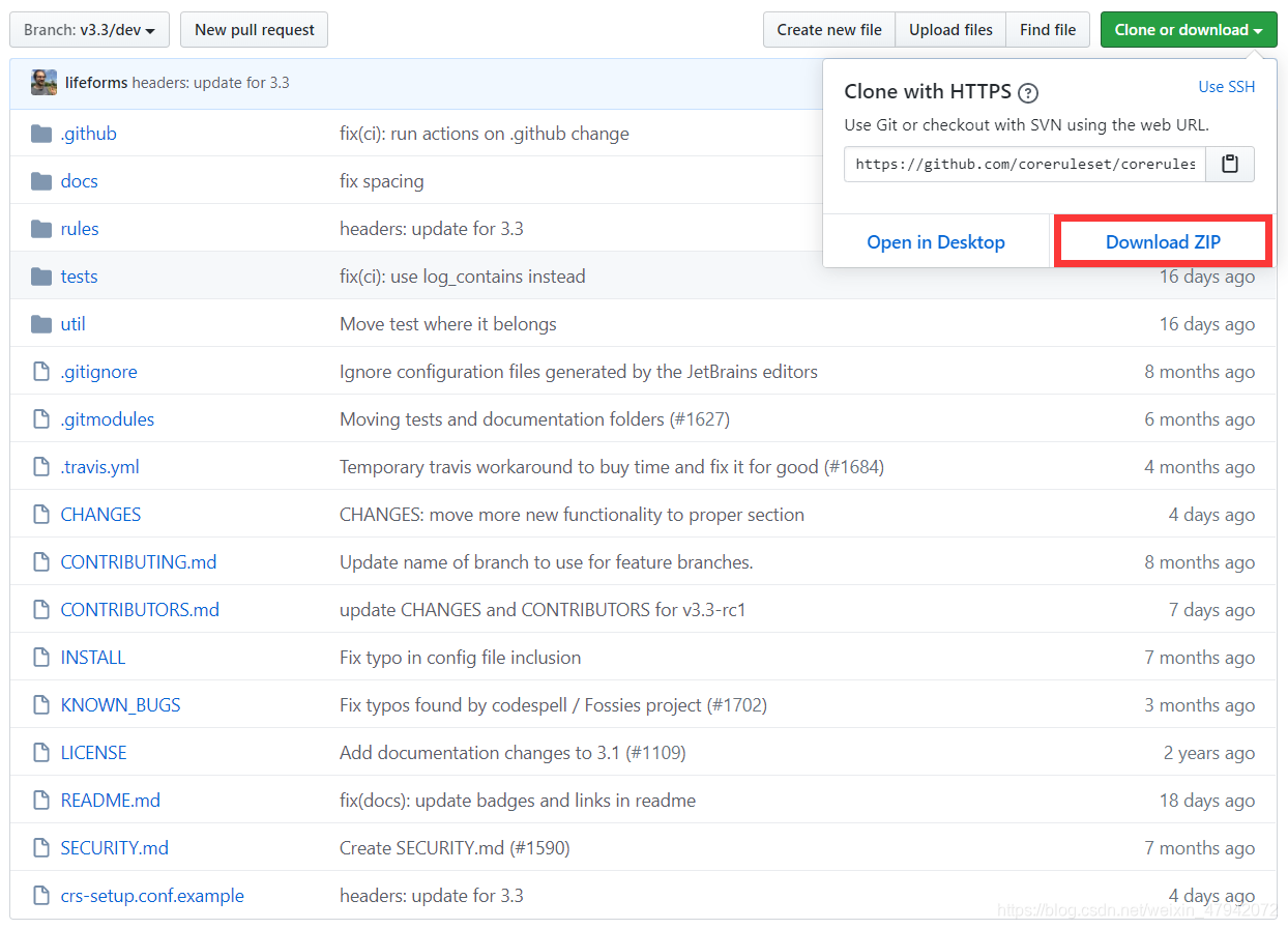 安装成功后,applicationHost.config文件(位于C:\Windows\System32\inetsrv\Config目录下),会自动添加以下内容,表示IIS下所有网站都会默认使肕odSecurity进行防护: 三、规则配置 虽然IIS版的ModSecurity安装后自动包含了规则文件,但由于自带的规则文件版本较老,因此需要手动将规则文件进行更新。 首先,访问https://github.com/coreruleset/coreruleset下载规则文件: