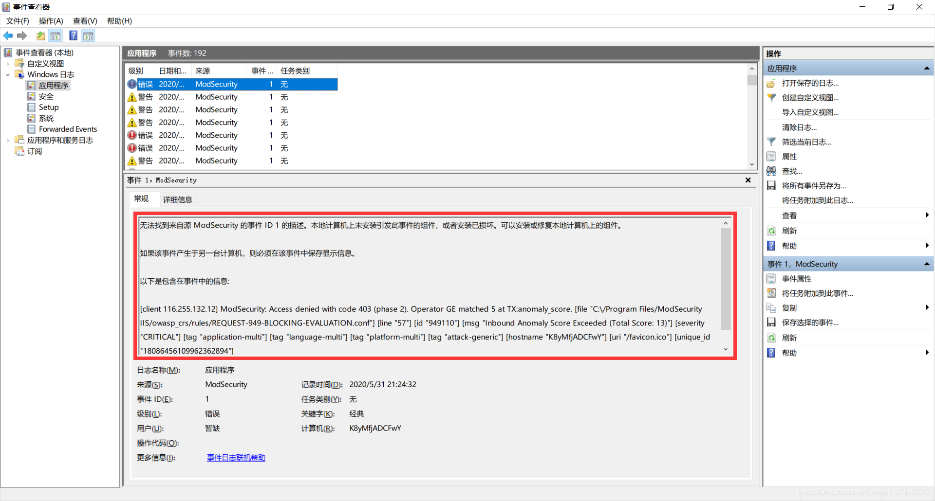 同时可在"控制面板-管理工具-事件查看器-Windows日志-应用程序"中查看拦截日志。