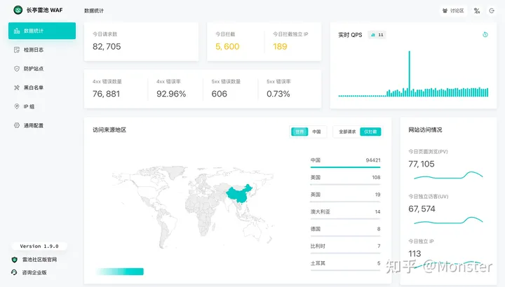 雷池社区版雷池社区版是长亭科技根据企业版雷池 Web 应用防护系统提炼而来,核心检测能力由长亭首创的智能语义分析算法驱动。项目开源了语义分析算法的核心引擎和相关安全插件,控制台未开源。优点在于防护效果好,项目迭代快,界面清爽好用,缺点在于社区版相比企业版功能较少,但能满足 WAF 的基本需求。 ![]()