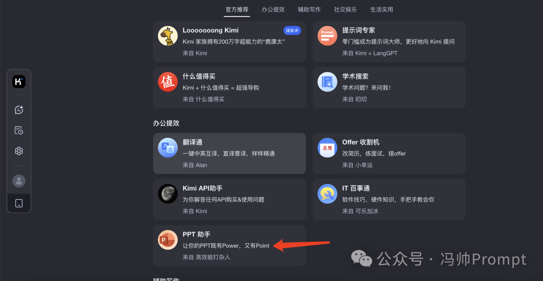 在Kimi+中,有一个【PPT助手】功能,点击进去。