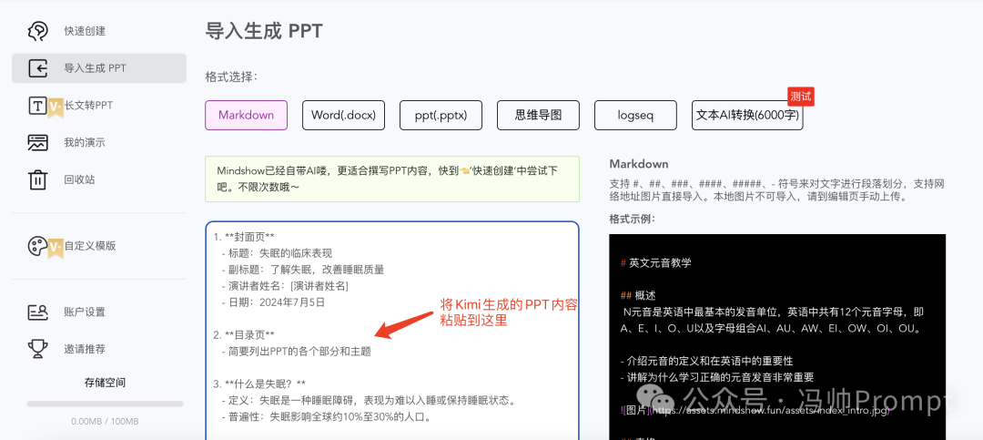 然后将生成的内容导入到Mindshow这种可以识Markdown语法的PPT工具中,点击生成PPT即可,如下图: