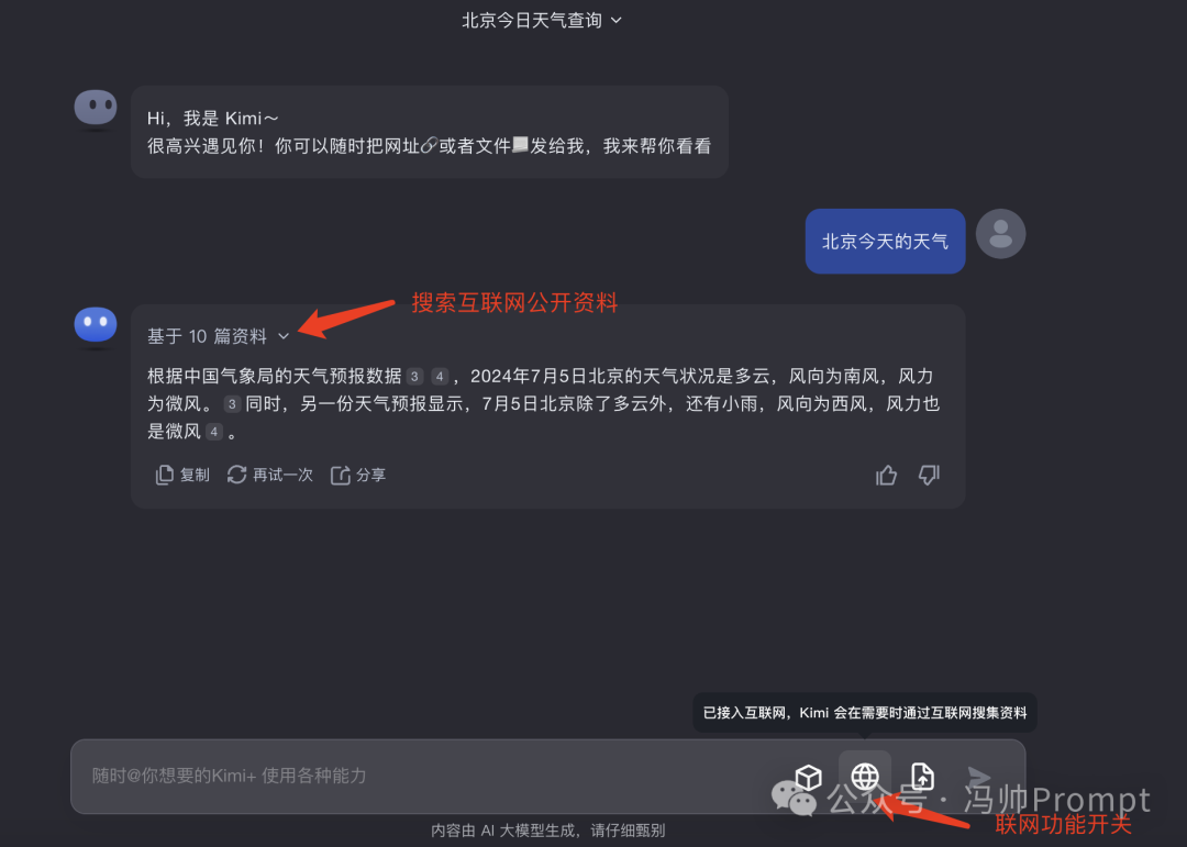 大模型本身不会去记忆这些联网数据,Kimi在接收到我们的问题的时候,会自行判断是否需要去联网搜索数据,如果需要的话它就会去搜索和问题相关的互联网数据,然后讲这些数据总结生成回答。