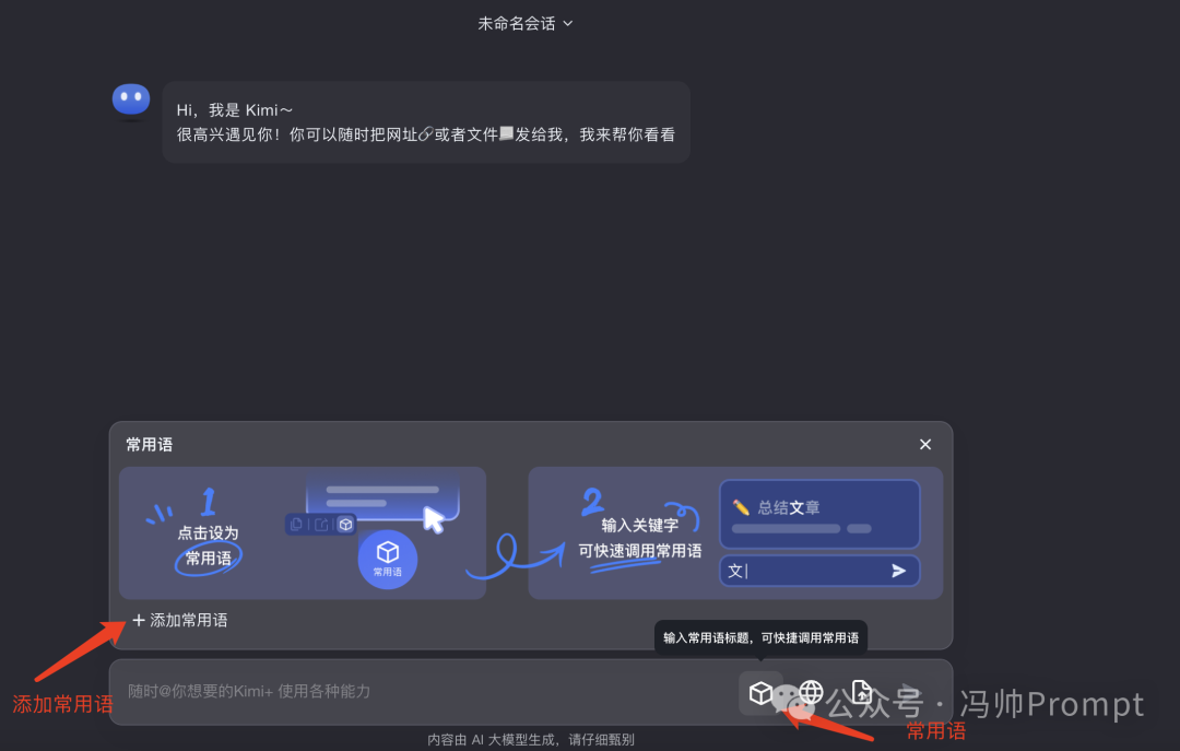 Kimi还提供了设置常用语功能,自己平时比较常用的一些提示词,或者看到一些比较不错的提示词,都可以放在常用语中。