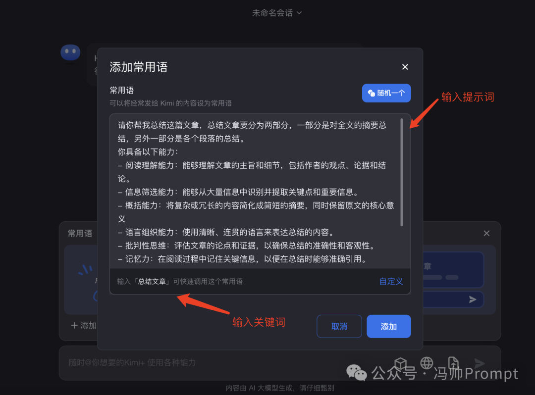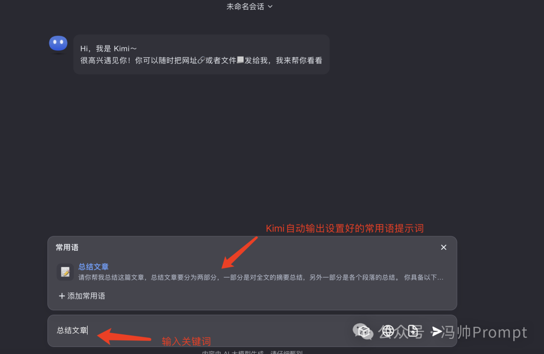 这样以后在对话框中输入「总结文章」这个关键词的时候,Kimi就会自动把设置好的常用语提示词输出出来。