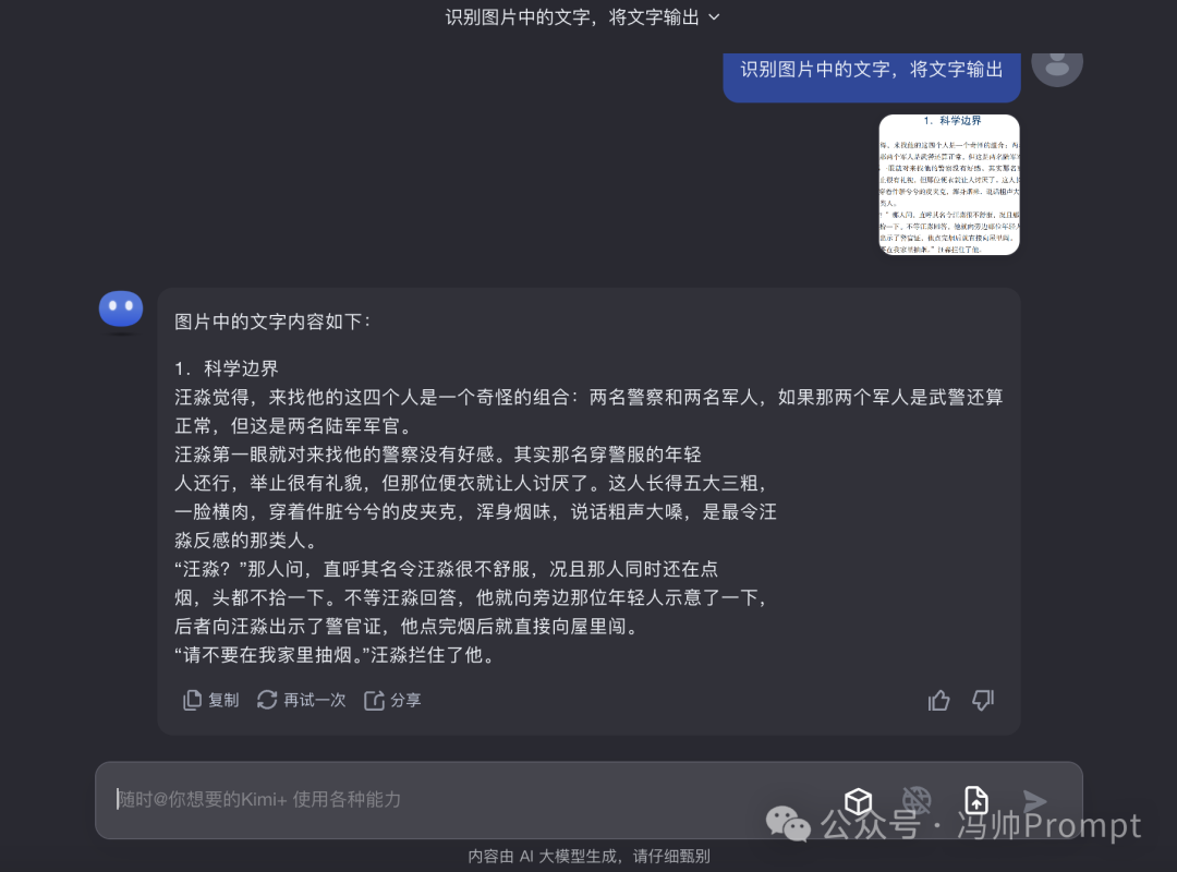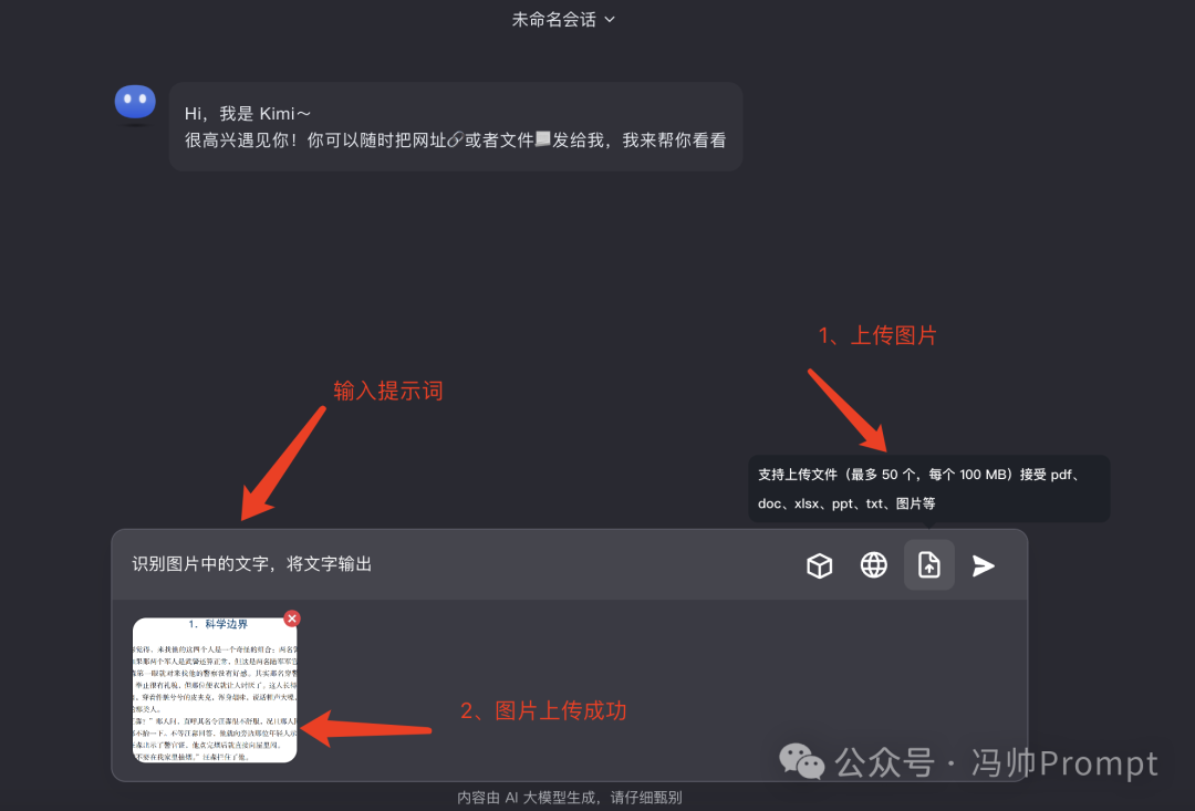 在上传文件那里,我们可以上传一些图片文件,直接告诉Kimi让它识别图片中的文字内容,然后将文字内容输出出来即可。