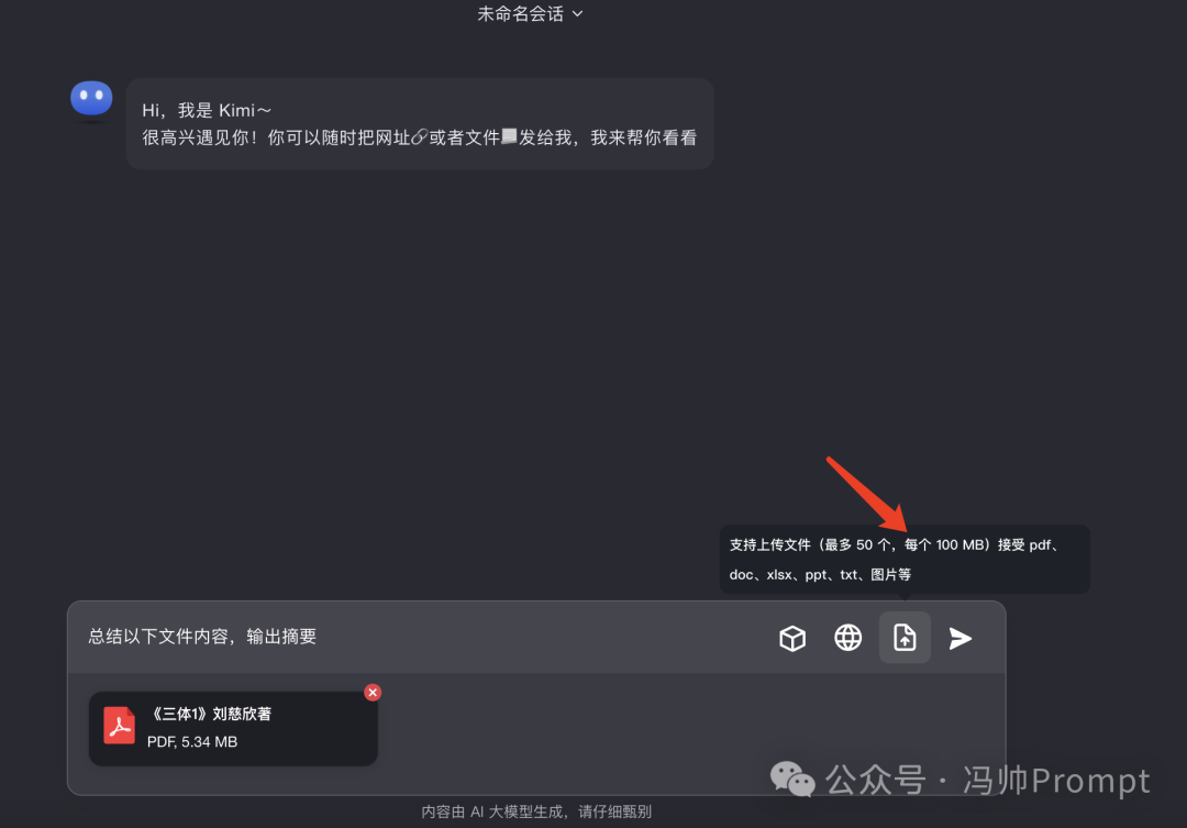 Kimi可以处理20万字的文件内容,下面我上传《三体》第一部这本书,让它做摘要总结。