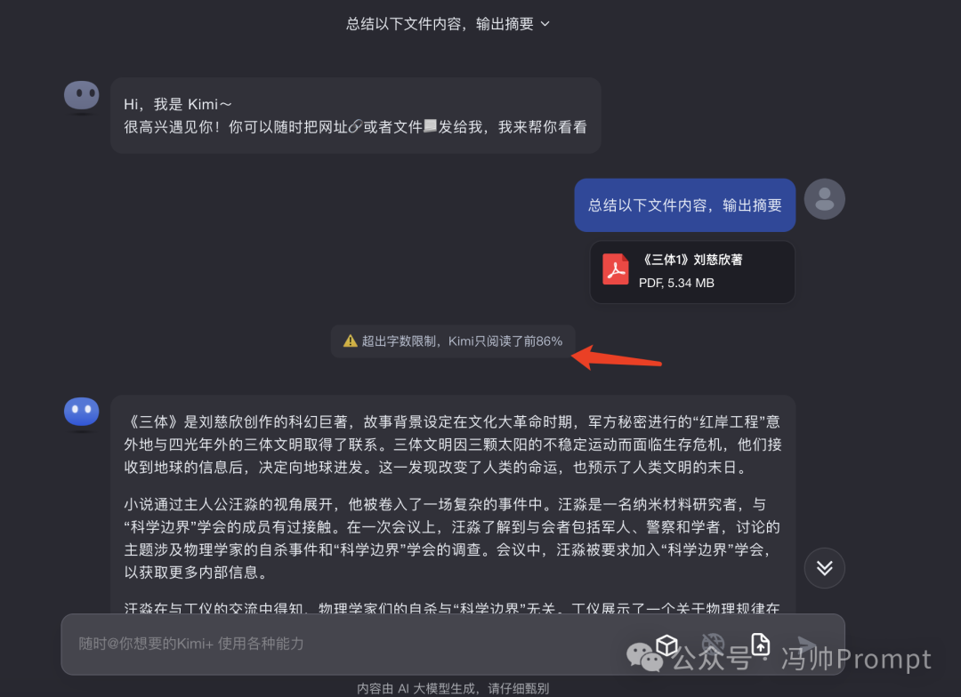 不得不说,Kimi确实严格控制最多只读取20万字,上传的《三体》第一部有20多万字,它就没读完,直接告诉了我们:超出字数限制,Kimi只阅读了前86%