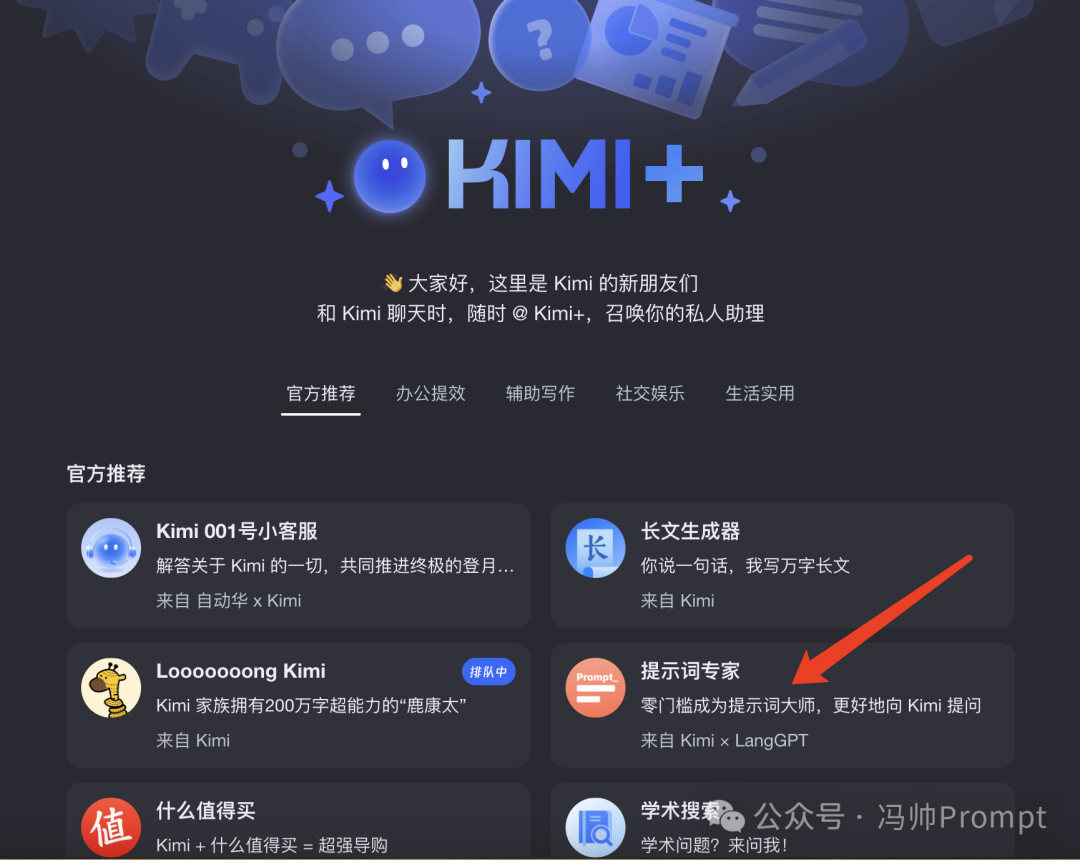 在Kimi+中,Kimi官方提供了一个可以帮助我们一键编写提示词的功能:【提示词专家】