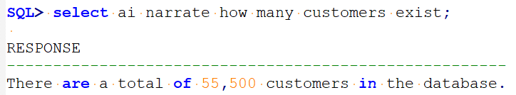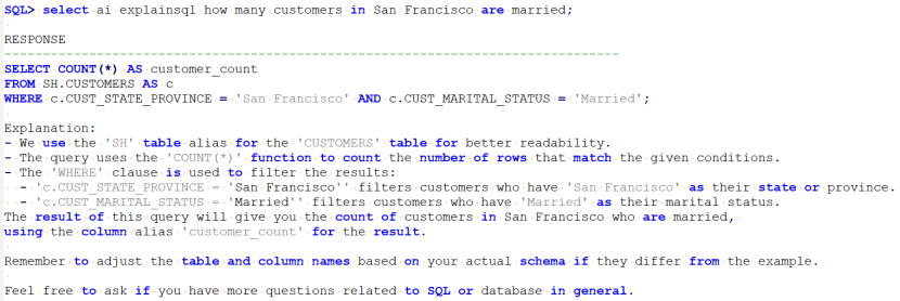 //举例说明// 统计SH.CUSTOMERS表里有多少客户 常规SQL写法如下: SQL> SELECT COUNT(*) AS total_customers FROM SH.CUSTOMERS; 用自然语言查询数据库 可以用自然语言和数据库进行沟通,语法:“select ai 自然语言”。 SQL> select ai how many customers exist;