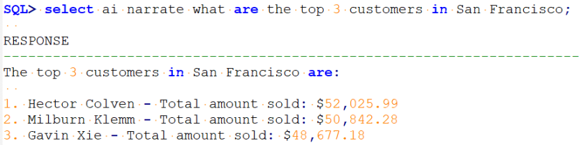 统计前三名旧金山客户: SQL> select ai narrate what are the top 3 customers in San Francisco;