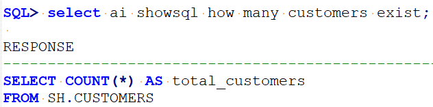 不会写SQL怎么办?不用担心,SELECT AI可以自动生成SQL语句! 用自然语言生成SQL 可以用自然语言生成SQL语句,语法:“select ai showsql 自然语言”。 SQL> select ai showsql how many customers exist;