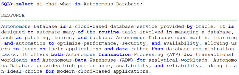 用SELECT AI辅助其他工作 例如:我想知道什么是Autonomous Database? SQL> select ai chat what is Autonomous Database;