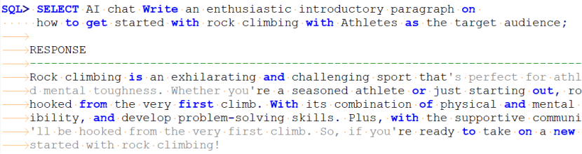 例如:让SELECT AI帮写一段热情的引言,介绍如何开始以运动员为目标受众的攀岩运动。 SQL> SELECT AI chat Write an enthusiastic introductory paragraph on how to get started with rock climbing with Athletes as the target audience;