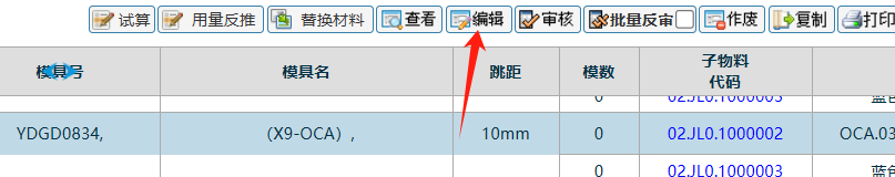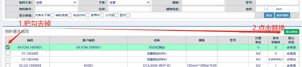 ![]() 点击进入 如下图: ![]() 点中一条后,再点击编辑按钮 如下图: 点击替用料的正方形框 如下图: ![]() 在弹出的新窗口查询后,把已勾选的勾去掉,再点击替换 如下图: