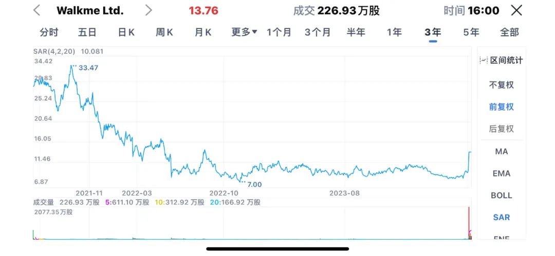 应用场景2:为用户提供自助服务支持(帮助用户) WalkMe 也是一个强大的自助服务支持平台。 聊天机器人功能 ActionBot 为用户提供常见问题的答案、推荐相关的自助资源并响应常见请求。 应用场景3:跟踪产品分析以进行数据驱动的决策(帮助产品经理) WalkMe 提供一系列分析功能,可以对用户行为进行详细分析。 用户记录可以更详细地洞察用户行为。 通过这些记录,您可以观察用户与产品交互时采取的每一个动作,从而识别UI 中的摩擦区域。 所有数据均可在自定义报告和仪表板中可视化。 使用场景4,调查问卷(帮助产品经理) 通过调查收集客户反馈以了解情绪。 WalkMe 使您能够大规模收集客户反馈,以便您不仅可以更好地了解用户的行为,还可以了解他们行为的原因。 WalkMe 调查允许您提出多项选择或开放式问题以获得定性回答。 二、几个疑问 1,Walkme是个小工具,值这么多钱?是不是SAP 人傻钱多 我们看一下Walkme上市后的股价,最高时达33.47. 再看一下Walkme在23年的财务数据。 现在SAP的收购价是高峰的40%,算是抄在谷底。 考虑到2023年的ARR是2.67亿美元,收购价格才是ARR的5.6倍。 而在SAAS企业投资热时的估值一般是15-20倍,这可太便宜了。 2,这个东西和ERP有什么关系? 这是是ERP的辅助工具,是数字化的辅助使用工具,离ERP的核心是比较远了,算是BTP的外围。 3、这个小产品,SAP有数万工程师,为什么不自己开发一个(抄一个)? 首先这是SAAS产品,这个SAP已经不擅长了。 其次,这是C端应用,用户体验第一,也是SAP不擅长的领域。 不擅长的领域,老老实实收购一个,不丢人。 自己开发有时间成本,也有机会成本。 三、我的理解 1,SAP的新战略下,需要更多的SAAS产品,来提升平台的价值 未来SAP的战略是:ERP核心+BTP平台+SAAS生态产品。 SAP在ERP核心+BTP+生态产品的战略下,可以容纳更多也需要更多的SAAS产品,就像Salesforce一样。 SAP本身大量的SAAS产品也是并购回来的。 因为SAP的SAAS产品开发经落后了,通过并购丰富产品线,是一个非常合理的选择。 2,可能同时是个财务投资,逢低吸纳 即使Walkme整合进去,这个是SAP的边沿产品,从产品战略上来看是锦上添花的事,有当然好,没有也关系不大。 不需要从产品的角度猜测太多。 我个人感觉更象财务投资。 本身Walkme处理价值低位,按ARR才是5.4倍(高峰期,SAAS的估值是15-20倍ARR),有投资价值。 在未来通业务优化进行价值投升(增加客户量),在市场气氛好转(估值提升),SAP完全可以赚较大的差价。 在2200亿美元的公司价值下,15亿美元的小投资,我认为一个CFO不难做的决策。 很容易理解,如果SAP在现在的客户群里推销Walkme,将Walkme的ARR提升个X倍,再在市场气氛好转时上市。 在SAAS的生态下,产品间本身是松耦合,完全可以分拆上市,这个项目,SAP咋算不会亏。 SAP有类似的案例在前。SAP 在2018年11月以80亿美金收购Qualtrics,2021年1月,美股高点时,SAP将Qualtrics独立上市,当时市值273亿美元。随后以125亿美元的估值出清剩下的股份。简单估算,2年多时间,SAP赚了50%以上,赚了40亿美元以上。 SAP不但是500强后面的大师,也是投资高手。 点晴模切ERP更多信息:http://moqie.clicksun.cn,联系电话:4001861886 该文章在 2024/7/11 17:44:11 编辑过 |