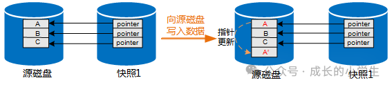 1. 什么是快照 SNIA(存储网络行业协会)对快照(Snapshot)的定义是:关于指定数据集合的一个完全可用拷贝,该拷贝包括相应数据在某个时间点(拷贝开始的时间点)的映像。快照可以是其所表示的数据的一个副本也可以是数据的一个复制品。 快照的价值有以下三点: 快速备份/恢复:快照可迅速生成,并可用作传统备份和归档的数据源,缩小甚至消除了数据备份窗口,快照存储在磁盘上,可以快速直接存取,大大提高数据恢复的速度。 保存多个恢复点目标:基于磁盘的快照使存储设备有灵活和频繁的恢复点,可以快速通过不同时间点的快照恢复数据。 重新定义数据用途:快照提供一份接近实况数据的拷贝,可供测试、归档、查询使用,既保护生产系统又赋予备份数据新的用途。 根据实现方式的不同,最常用快照可以分成两类: 写时复制(COW:Copy On Write); 写时重定向(ROW:Redirect On Write)。