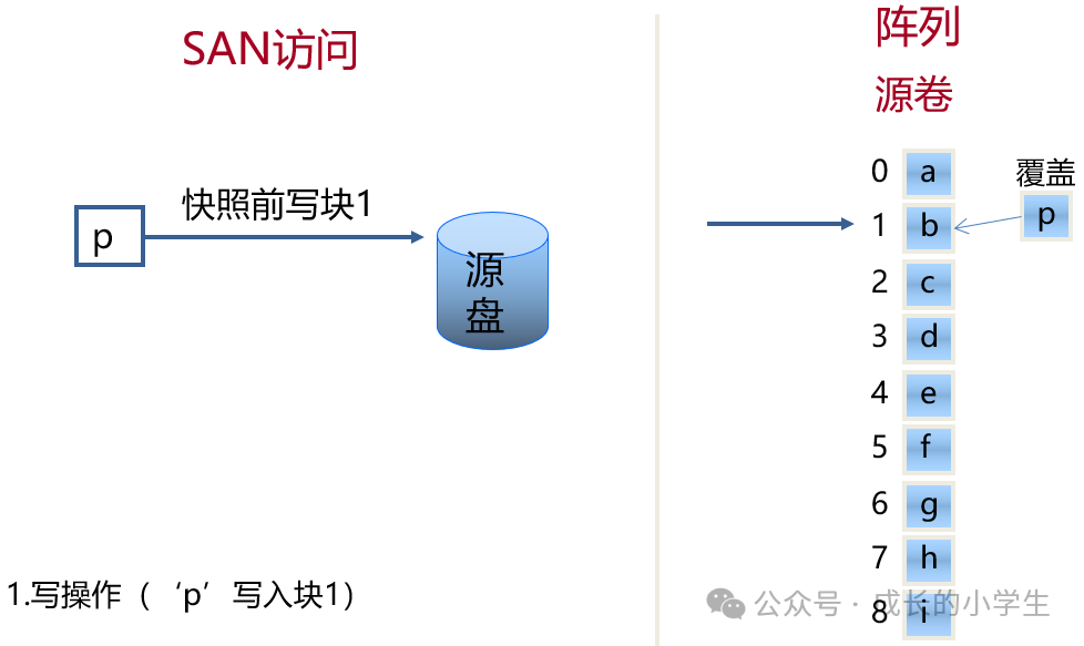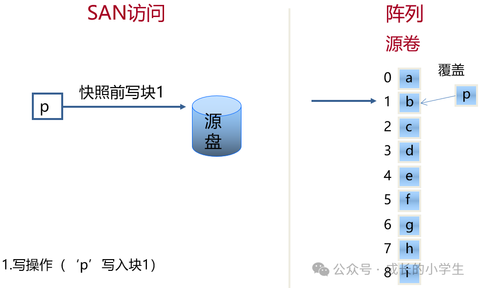 2. 图解COW技术 在做快照前,服务器往存储设备写入数据将直接覆盖原来数据块,如下图所示,数据'p’写入数据块1中,将覆盖原有数据'b’。