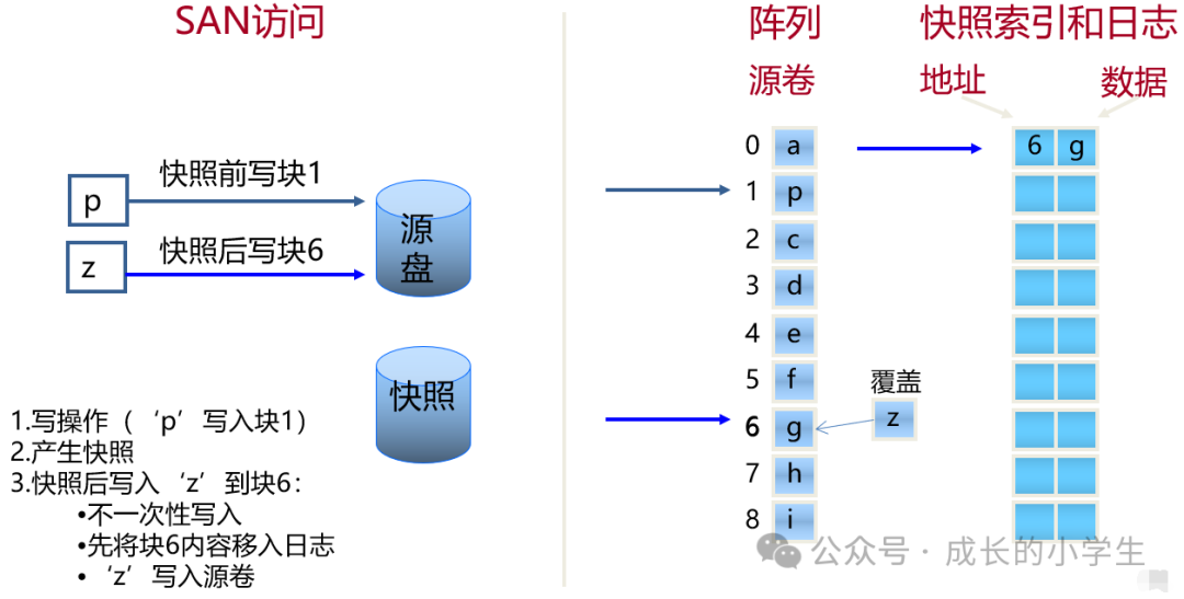 创建快照时,COW 快照需要消耗一些存储空间建立快照卷。当我们为一个数据卷创建一个快照之后这些预留的空间用来存放被变化数据更新的旧数据。COW快照在初始化的过程中仅仅创建用来描述源数据块位置的指针信息(元数据),而不是完整的将源数据块拷贝过来。因此初始化的过程几乎可以在瞬间完成,对系统的影响也很小。 COW 快照会跟踪数据卷的写操作和数据块变化。当某个数据块发生改变时,在将旧的数据覆盖之前,首先将该块的旧数据复制到预留的快照卷,该步骤仅在数据卷相应数据块位置发生第一次写操作请求时进行。这个处理过程确保快照出来的数据与发起快照的那个精确时间点保持完全一致。 需要注意的是,根据COW的机制,快照创建以后,如果有对原卷的数据修改,修改的数据第一次被修改的时候就把数据COPY到快照卷里。如下图所示若块6内容再发生变化就不会被保存,因为它们所位置的数据已经不是第一次改变。这样做是为了保证恢复数据时能够恢复到启用快照时的数据状态(即源数据卷对应位置是数据块6内容是'g'时的状态)。