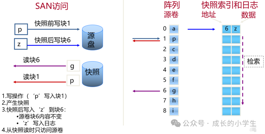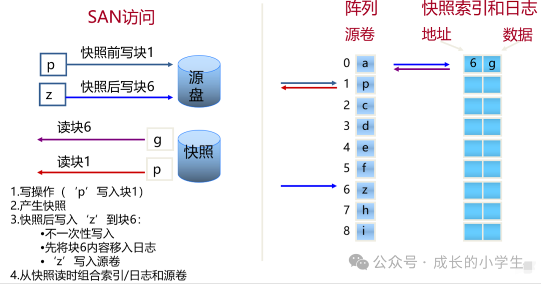 需要恢复某个时间点的快照数据时,只需读取源卷数据即可。如下图所示将读取原卷上的数据'apcdefghi’。由于块1上的数据是'b’是在快照前改写成'p’的,所以无法恢复。