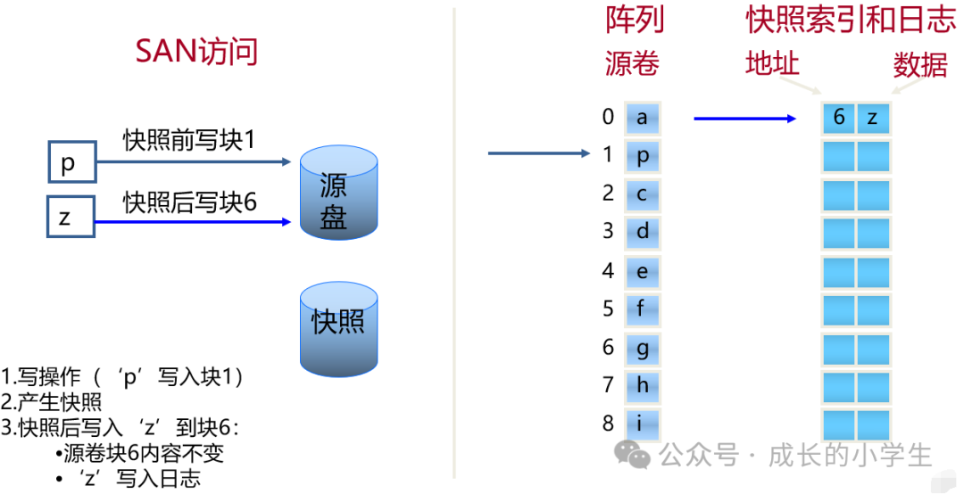如果需要访问某个时间点的快照数据时将组合索引/日志和源卷,对没有改变过的块直接从数据卷读取,对已经改变并被复制的块则从快照空间读取。从快照被创建那一刻开始,每个快照都会跟踪记录描述块改变的元数据信息。 如果要恢复上一次快照点的数据,如下图所示将读取源卷上的数据'apcdefhi’和快照卷上的数据'g'组合成'apcdefghi'数据。由于块1上的数据是'b’是在快照前改写成'p’的,所以无法恢复。