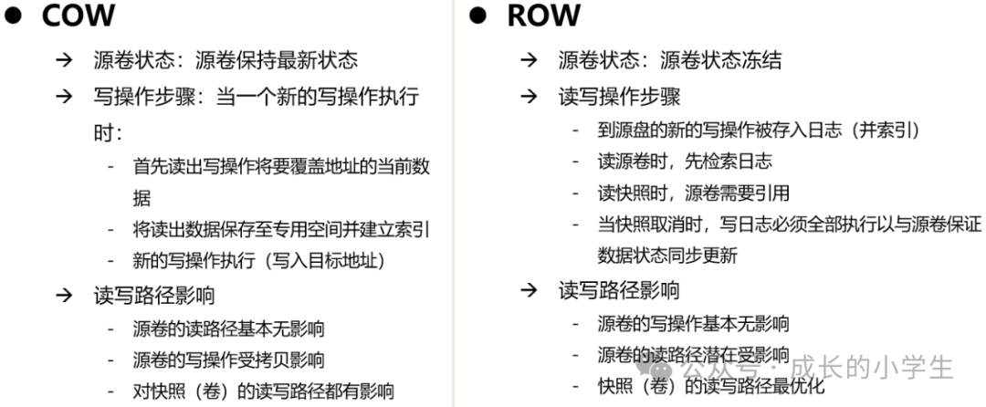 4. 对比分析 “ROW 重定向写”与“COW 复制写”是相对的概念,ROW可以避免两次写操作引起的性能损失。ROW 同COW一样在空间利用方面效率非常高。ROW把对数据卷的写请求重定向给了快照预留的存储空间,而写操作的重定向设计则把需要两次写才能完成的操作减少为一次写。COW的两次写操作包括将旧数据写入快照卷和在数据卷写入新数据。而ROW只有写入新数据一步。 COW最大的问题是对写性能有影响。第一次修改原卷,需要复制数据,因此需要多一次读写的数据块迁移过程。这会造成应用需要等待较长时间。但原卷数据的布局没有任何改变,因此对读性能没有任何影响。 ROW 最大的问题是对读性能影响比较大。ROW写的时候性能基本没有损耗,只是修改指针,实现效率很高。但多次读写后,原卷的数据就分散到各个地方,对于连续读写的性能不如COW。