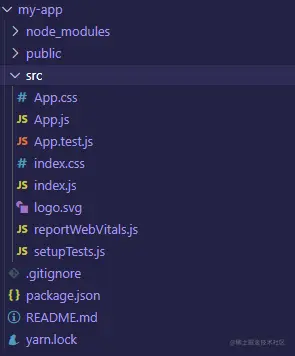 然后你就可以在浏览器中看到默认的React的页面了,创建完成后的文件效果如下图所示: