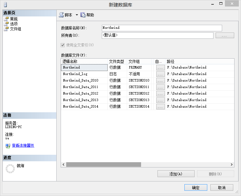 FILEGROUP [SECTION2014] ( NAME = N'Northwind_Data_2014', FILENAME = N'F:\Database\Northwind\Northwind_Data_2014.ndf' , SIZE = 5120KB , FILEGROWTH = 1024KB ) 查看数据库文件组SQL语句: