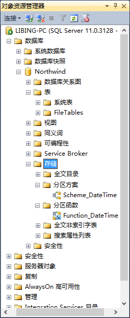 示例:创建将用于Order表的分区方案 CREATE PARTITION SCHEME Scheme_DateTime分区函数和分区方案创建之后,可以在数据库的【存储】中查看: