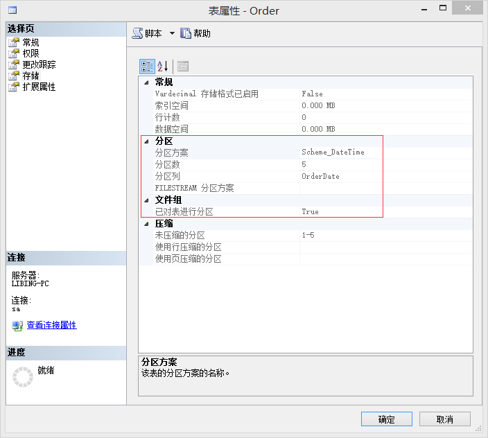 OrderDate DATETIME NOT NULL) ON Scheme_DateTime ( OrderDate )这里需要注意分区表不能再创建聚集索引,因为聚集索引可以将记录在物理上顺序存储,而分区表是将数据存储在不同的表中,这两个概念是冲突的,所以在创建分区表时不能再创建聚集索引。 完成Order表创建之后,查看表的属性,可以看到Order表已经是分区表。