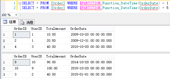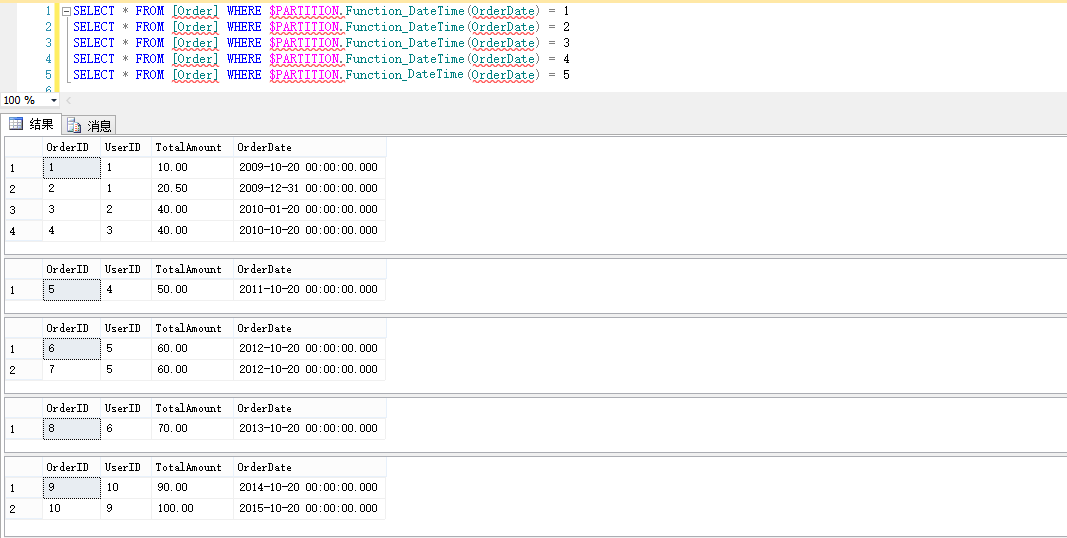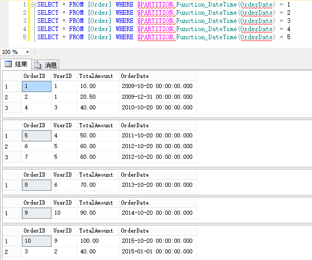 3. 操作分区表 3.1> Insert数据 USE [Northwind] GO INSERT INTO [dbo].[Order] ([UserID],[TotalAmount] ,[OrderDate]) VALUES (1 ,10.00 ,'2009-10-20'); INSERT INTO [dbo].[Order] ([UserID],[TotalAmount] ,[OrderDate]) VALUES (1 ,20.50 ,'2009-12-31'); INSERT INTO [dbo].[Order] ([UserID],[TotalAmount] ,[OrderDate]) VALUES (2 ,40.00 ,'2010-01-20'); INSERT INTO [dbo].[Order] ([UserID],[TotalAmount] ,[OrderDate]) VALUES (3 ,40.00 ,'2010-10-20'); INSERT INTO [dbo].[Order] ([UserID],[TotalAmount] ,[OrderDate]) VALUES (4 ,50.00 ,'2011-10-20'); INSERT INTO [dbo].[Order] ([UserID],[TotalAmount] ,[OrderDate]) VALUES (5 ,60.00 ,'2012-10-20'); INSERT INTO [dbo].[Order] ([UserID],[TotalAmount] ,[OrderDate]) VALUES (5 ,60.00 ,'2012-10-20'); INSERT INTO [dbo].[Order] ([UserID],[TotalAmount] ,[OrderDate]) VALUES (6 ,70.00 ,'2013-10-20'); INSERT INTO [dbo].[Order] ([UserID],[TotalAmount] ,[OrderDate]) VALUES (10 ,90.00 ,'2014-10-20'); INSERT INTO [dbo].[Order] ([UserID],[TotalAmount] ,[OrderDate]) VALUES (9 ,100.00 ,'2015-10-20'); GO 3.2> 查询数据所在物理分区表 在分区表中使用一般的SELECT语句无法知道数据是分别存放在哪几个不同的物理表中,若要知道数据分别存放的物理表,可以使用$PARTITION函数,该函数可以调用分区函数并返回数据所在物理分区的编号。 $PARTITION的语法:$PARTITION.分区函数名(表达式) SELECT $PARTITION.Function_DateTime('2010-01-01')