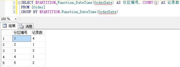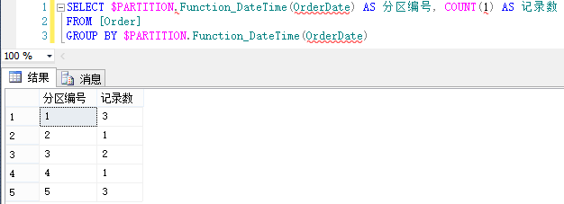 SELECT $PARTITION.Function_DateTime(OrderDate) AS 分区编号, COUNT(1) AS 记录数