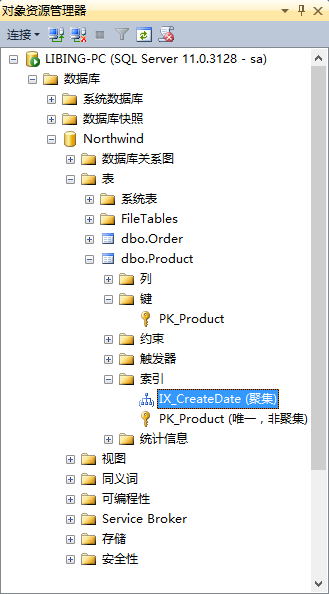 查看表Product的索引,可以看到PK_Product为聚集索引。