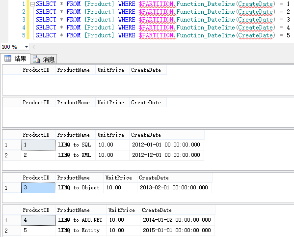 查询结果分区函数返回为1,说明2010-01-01的数据会存放在第1个物理分区表中。 使用$PARTITION函数可以具体知道每个物理分区表中存放了哪些记录。 查看物理分区表中存放的记录: SELECT * FROM [Order] WHERE $PARTITION.Function_DateTime(OrderDate) = 1