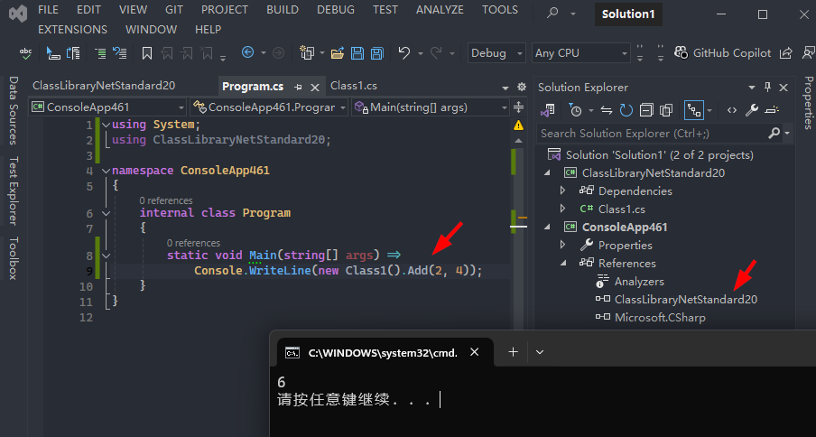 然后直接引用前面的ClassLibraryNetStandard20类库并写代码调用里面的函数,可以看到,程序可以正常运行: