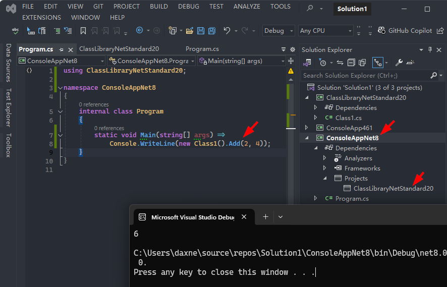 当然,这个ClassLibraryNetStandard20也可以被一个.NET 8的应用程序调用: