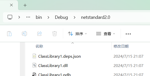 打开这个ClassLibraryNetStandard20项目的输出目录,可以看到,编译出来的程序集被放在了Debug\netstandard2.0目录下: