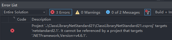 但是,如果我们新建一个.NET Standard 2.1的Class Library,则无法被.NET Framework 4.6.1的项目引用,此时会报错: