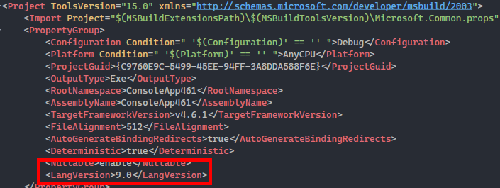 然后,修改csproj文件,将C#语言版本升级到C# 9.0: