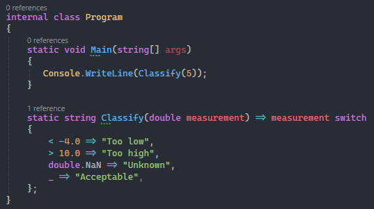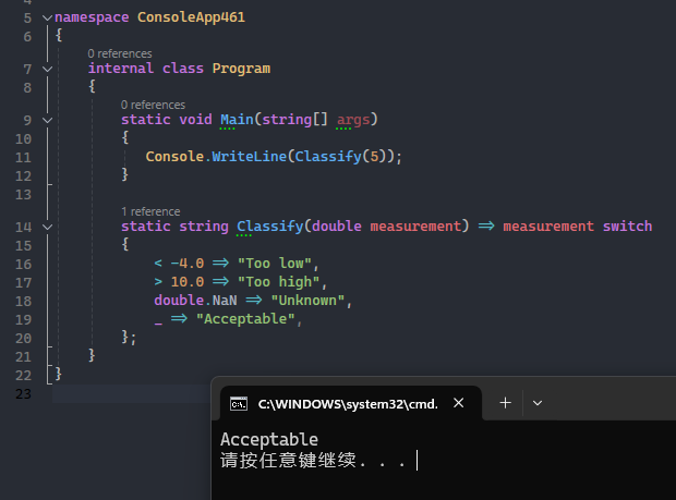 然后,使用C# 9.0中“关系型模式匹配”新特性编写一段代码: