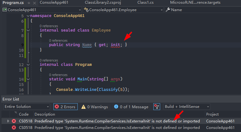 那么,是不是所有的C# 9.0的新特性,都可以在.NET Framework 4.6.1中使用呢?答案是否定的,就要看C# 9.0的编译器是否可以生成能够被该版本.NET Framework所支持的代码,或者说,C#编译器所生成的代码中依赖的那些类型,是否在该版本的.NET Framework下支持。举个例子,同样是C# 9.0的新特性,仅限Init的资源库新特性则无法直接在一个.NET Framework 4.6.1的项目中使用,编译器提示:Predefined type 'System.Runtime.CompilerServices.IsExternalInit' is not defined or imported