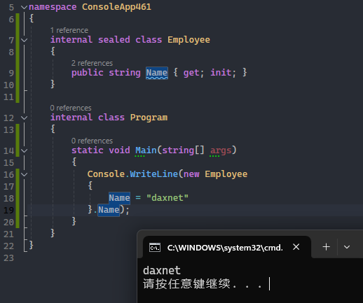 原因是,C# 9.0编译器在编译带有这个新语法特性的代码时,需要检查.NET下是否包含IsExternalInit类型,如果该类型存在,则允许使用该语法特性,而该类型在.NET Framework 4.6.1中不存在。因此,解决这个问题,既可以自己在项目中写一个空的IsExternalInit类型,或者引用一个第三方的IsExternalInit NuGet Package。之后就可以正常编译运行代码了:
