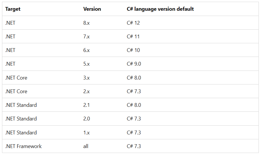 请注意:经典.NET Framework最高支持到C# 7.3,C# 8.0是专门面向.NET Core的第一个主要C#版本,它的一些新功能依赖于新的Core CLR的相关功能。【这篇官方文档】详细列举了C#语言的发展历史以及各个版本的新功能,下面这张表格列举了不同.NET版本下,创建新项目时所使用的默认的C#语言版本(参考官方文档):