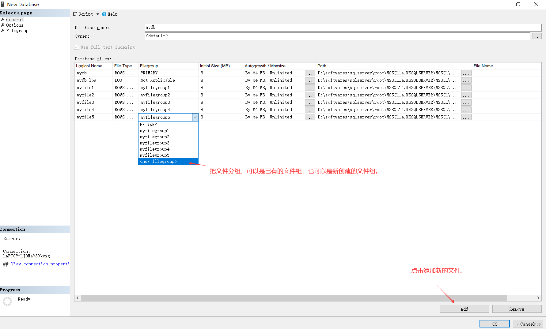 上面展示了在创建数据库时候创建数据文件和文件组。其实也可以数据库创建完成后,再创建数据文件和文件组。