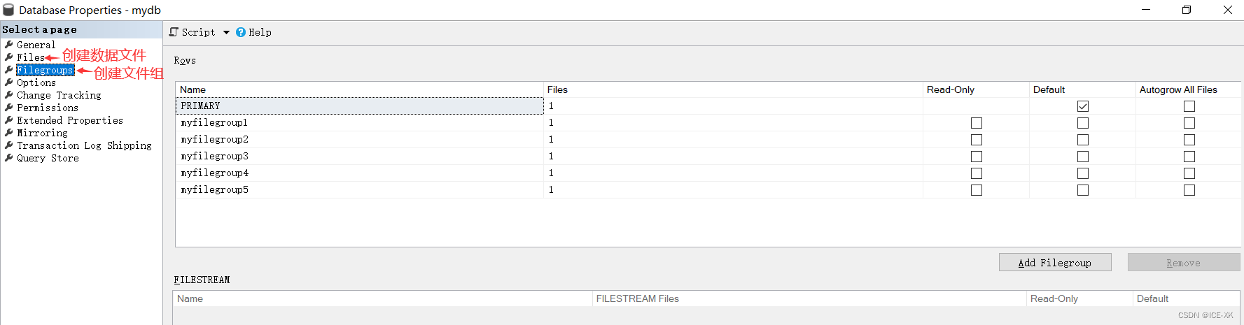 在创建完成数据库后,可以看到文件组可以被分为PRIMARY和你自定义的文件组两种。主数据文件(mydb)是属于PRIMARY文件组,并且不能被改变。myfile1,2,3,4,5是属于次要数据文件,次要数据文件的归组就比较随意,既可以是PRIMARY,也可以是你自定义的文件组。还有一个日志数据文件(mydb_log)不属于任何文件组。