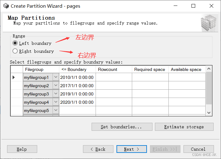 上面的left代表左边界,right代表右边界。当 数据库引擎 按升序从左到右排序时,边界值是属于左侧还是右侧(默认为左侧)。换句话说,就是一个为小于等于,另一个为小于。